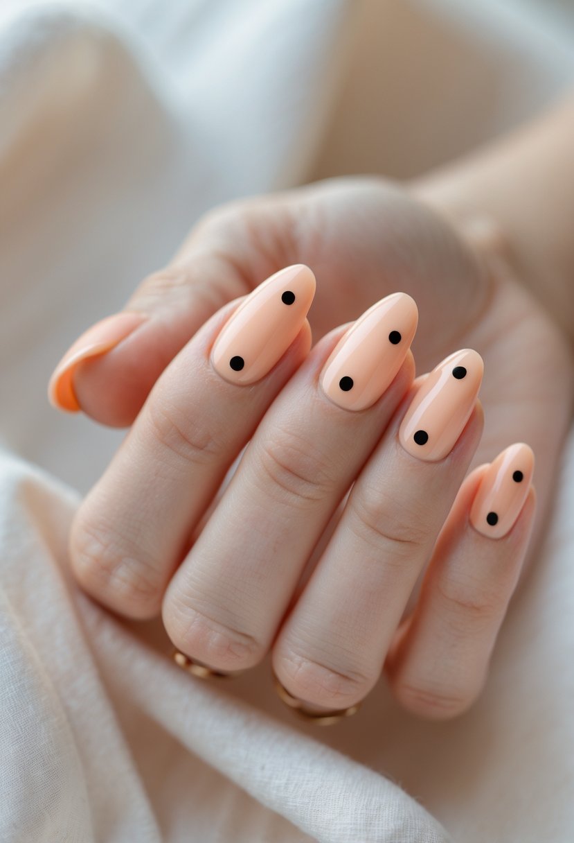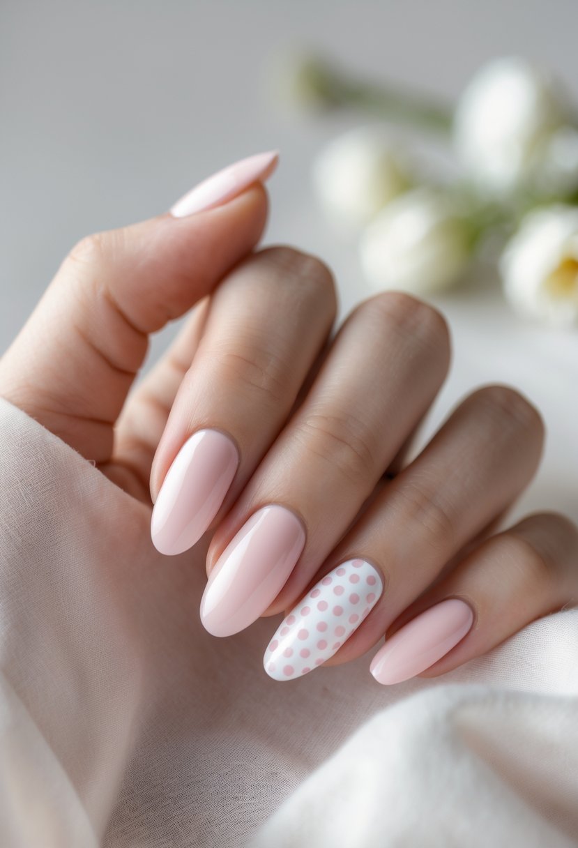 This style features soft light pink nails paired with simple white polka dots.