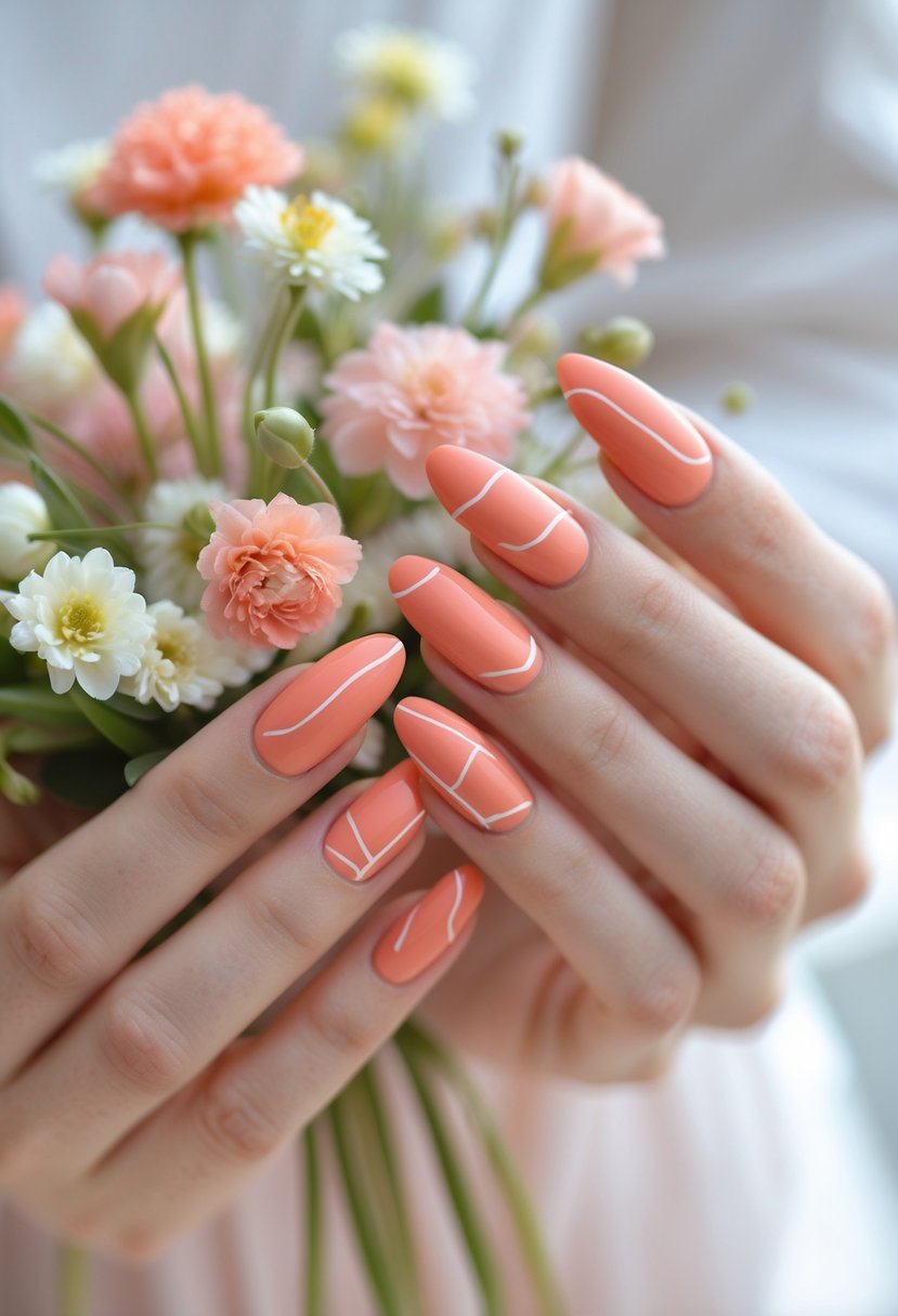 42) Peachy Pink Nails with Abstract Lines
