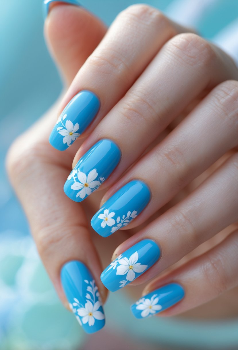 49) Sky Blue Nails with White Floral Tips