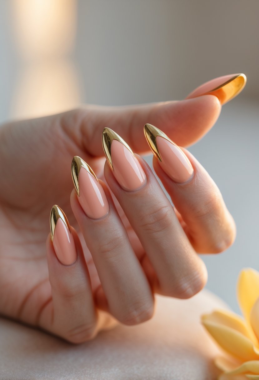 This nail design combines a soft peach base with sharp gold claw tips.